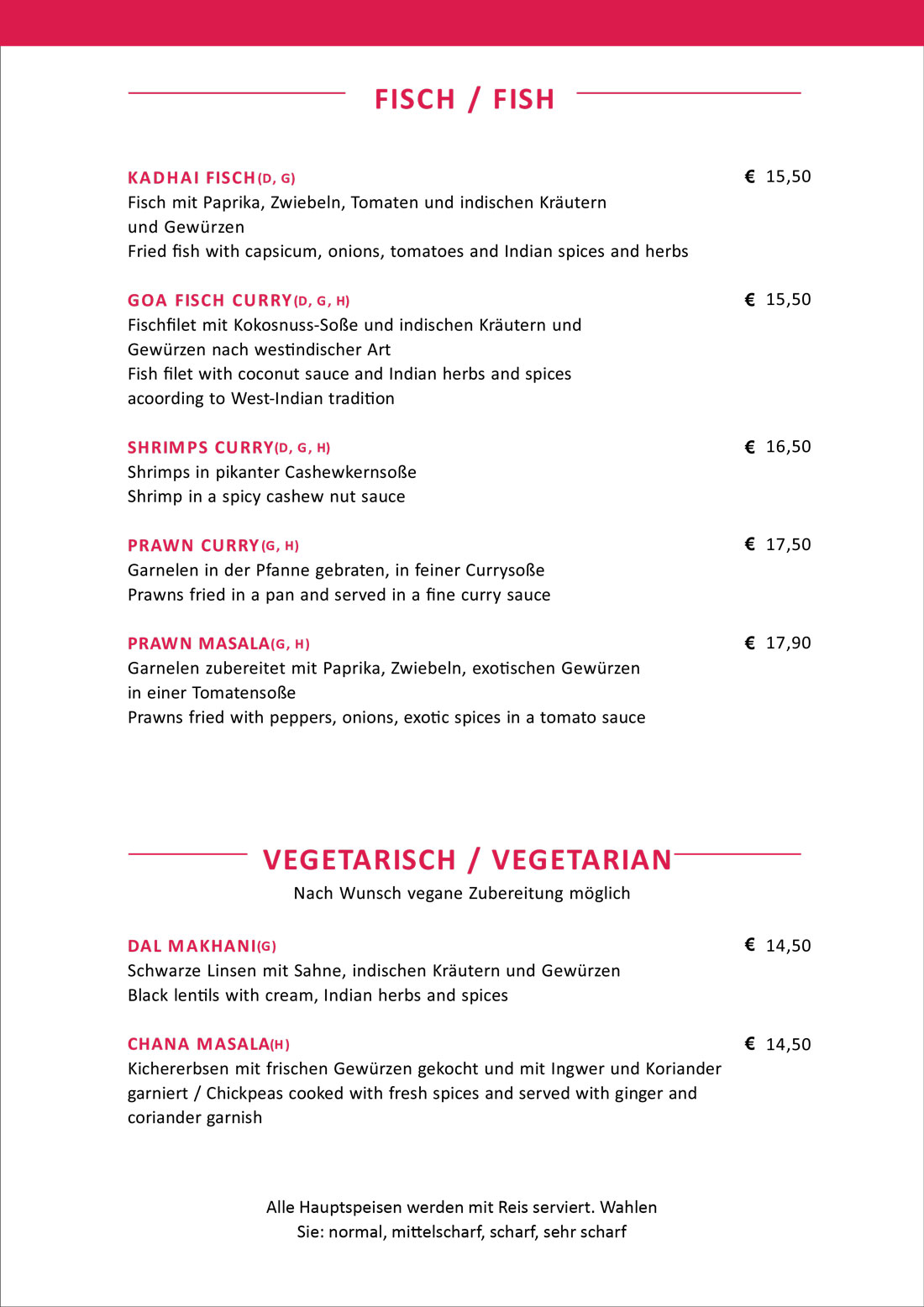 Wer keine unserer leckeren Suppen als Vorspeise möchte, dem empfehlen wir Pakora, ein Stück Gemüse, Käse, Fisch oder Fleisch, das in einen Teig aus Kichererbsenmehl getaucht und im Anschluss frittiert wird. Beim Hauptgericht können Sie aus Huhn- oder Lammfleisch sowie einer Vielzahl an Fischgerichten wählen. Aber auch unsere vegetarischen Freunde kommen nicht zu kurz: Ob Jalfrezi (Gemischtes Gemüse mit indischen Kräutern und Gewürzen), Palak Paneer (Hausgemachter Frischkäse mit Spinat, Tomaten, indischen Kräutern und Gewürze) oder eine unserer anderen Spezialitäten, der herzhafte Geschmack wird Sie begeistern. Als Beilage empfehlen wir die indischen Klassiker Reis, Fladenbrot und Naan.